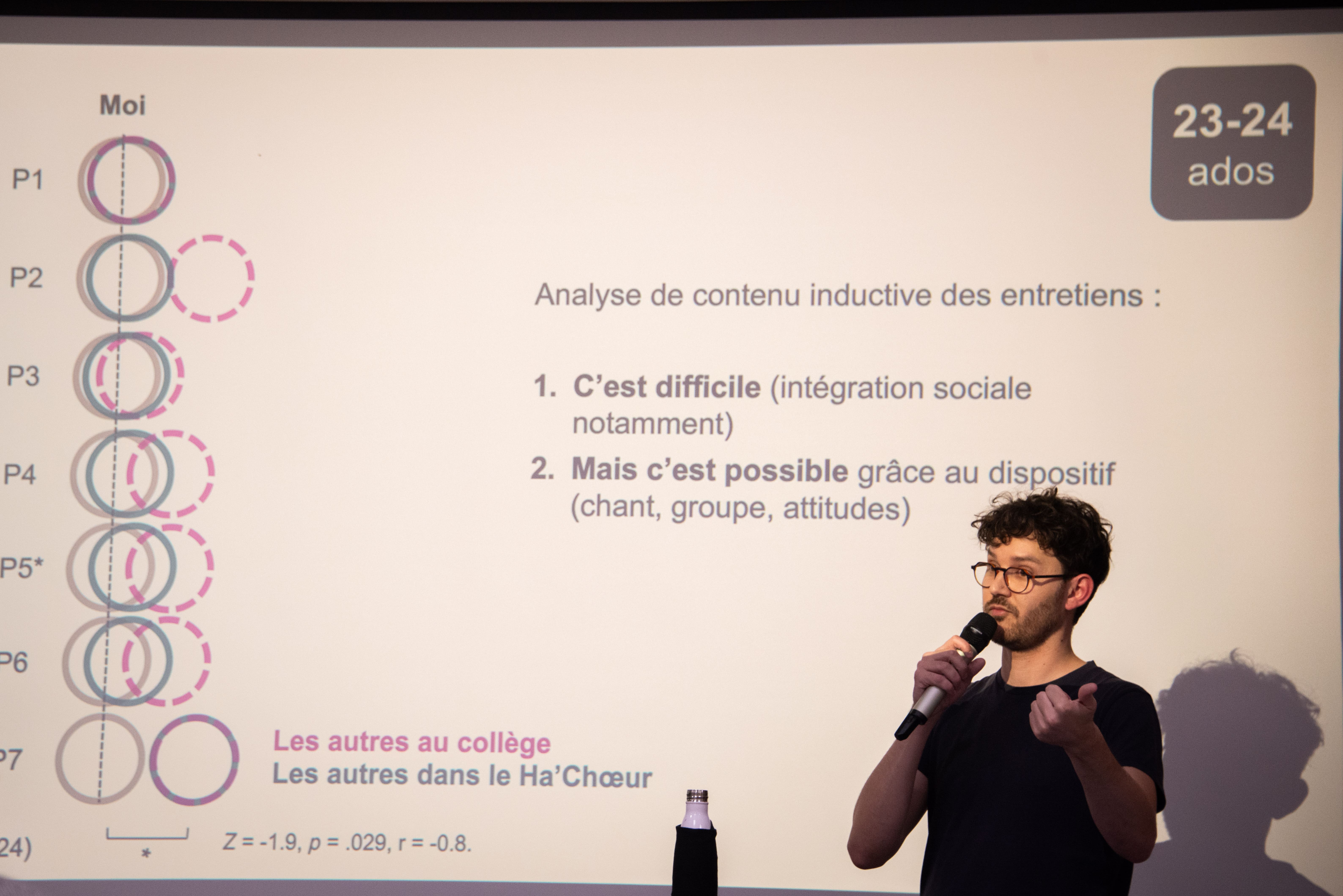 S’ensuit un temps d’échange avec la salle, d’abord avec les interventions des adultes présents du hachoeur ; puis chacun peut parler de sa propre expérience et de son rapport avec le chant.